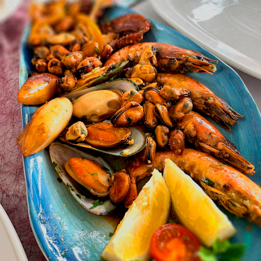 servido com misto de peixe do dia, camarões, arroz de lapas, legumes, salada, batata cozida, salsa, alho e azeite.
